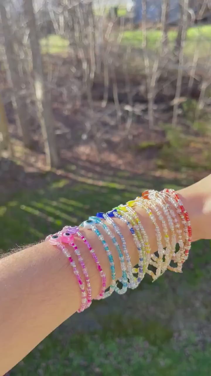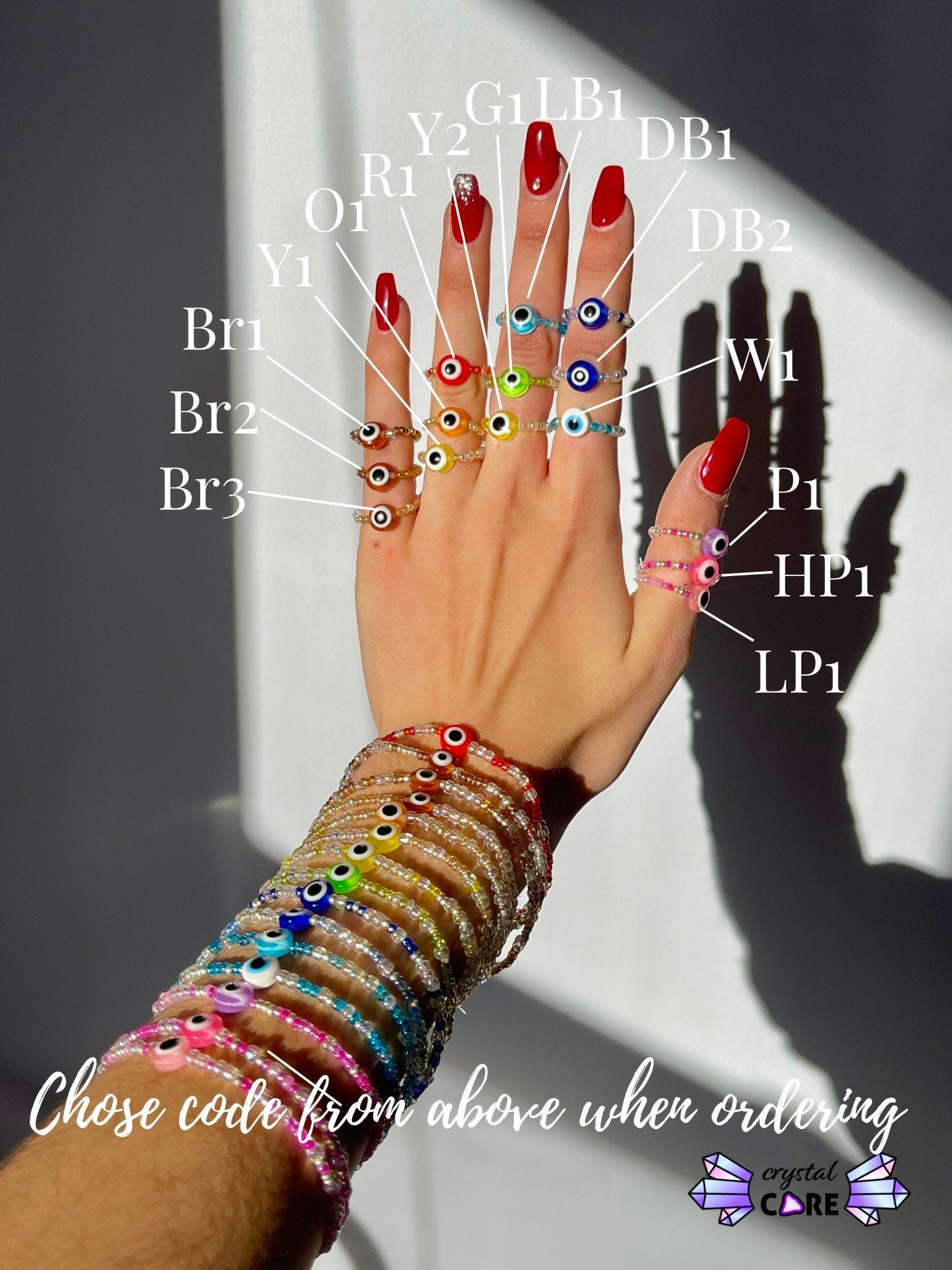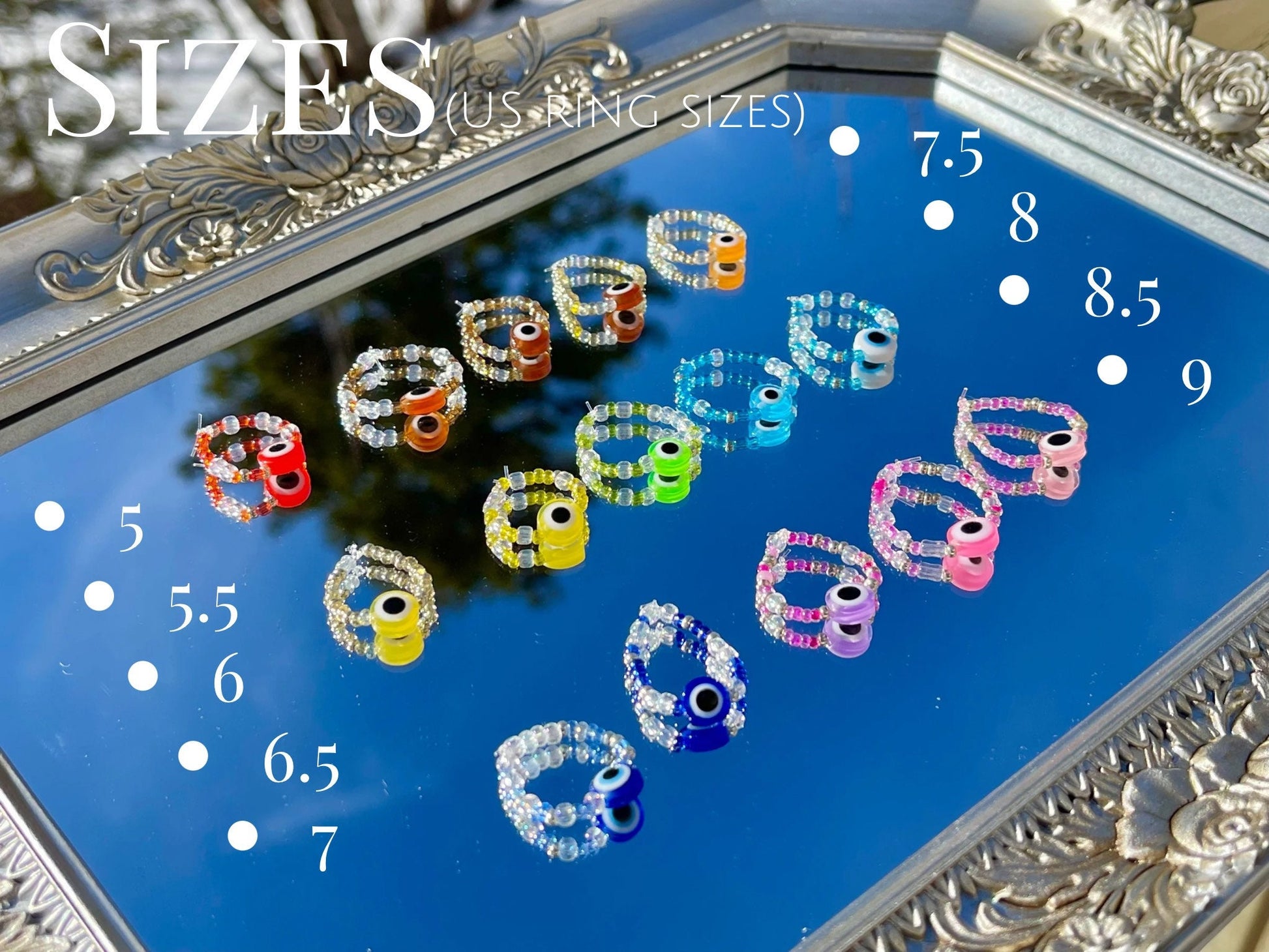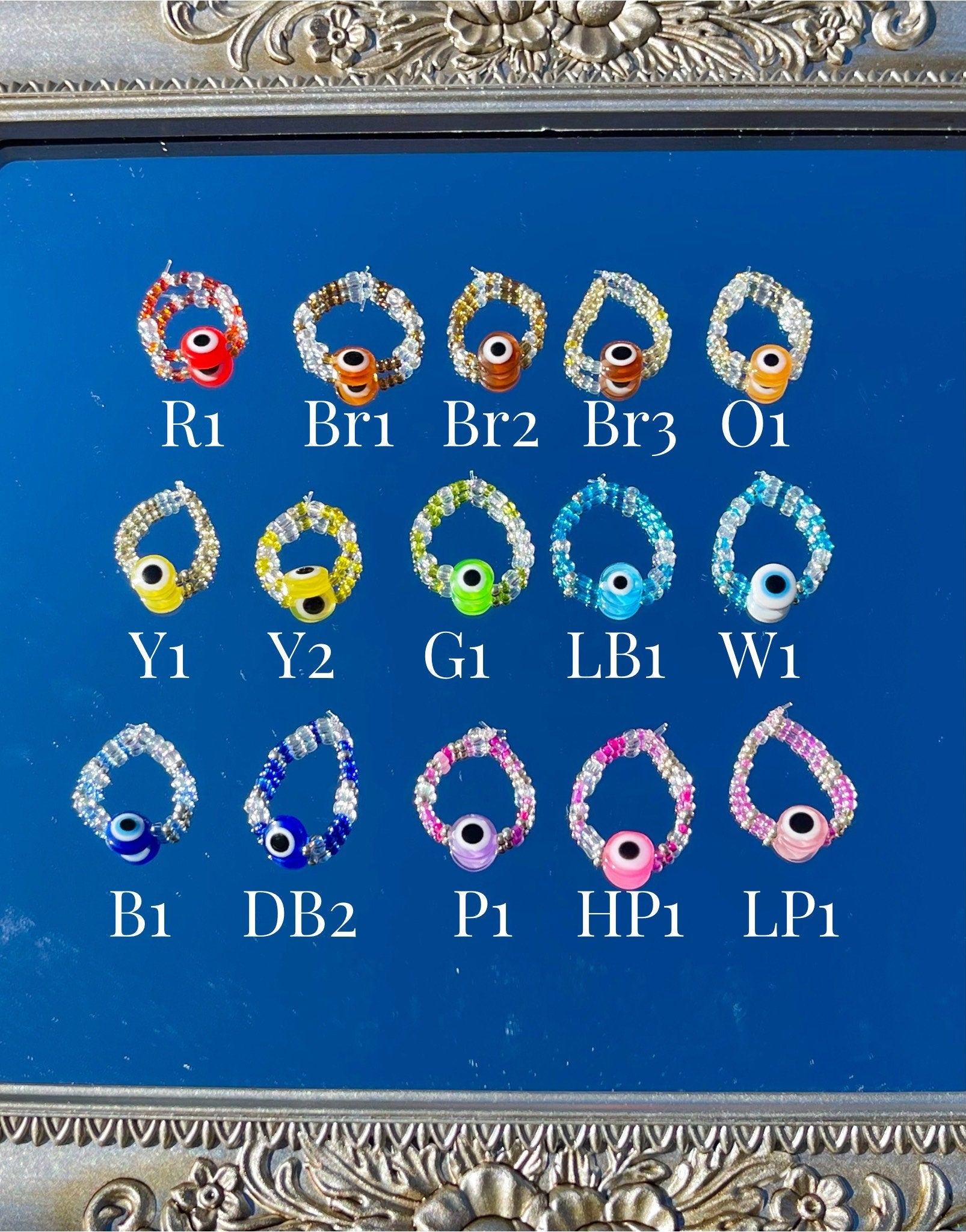 A stretchy, waterproof, colourfast (colours do not fade) and lightweight Evil Eye ring made with a random assortment of seed beads. This ring assures the owner of protection, support and love. Its caressing energy will bring reassurance and comfort in your everyday life.